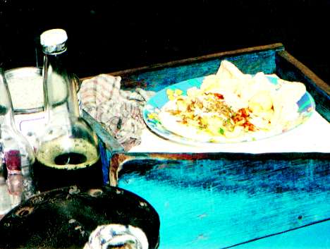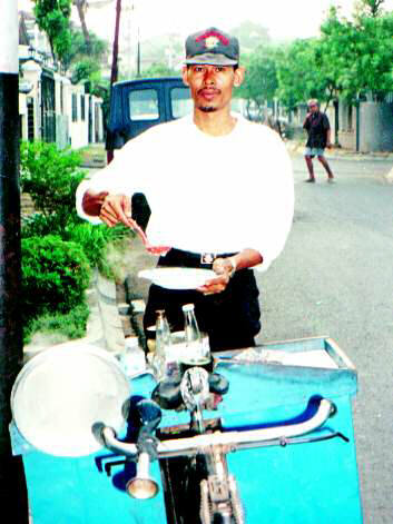 朝と言えば、この音が聞こえてくる。パフ−パフパフ・・・自転車でやって来るブブ−ル屋さん。ブブ−ルとは、インドネシア語でおかゆのこと。お米をやわらかく煮て、油揚げ、鶏肉のさいたもの、バワンメラ、サンバル、クルプックなどをのせてくれる。朝からこれだけ食べれば、もう、お腹も一杯という感じ。米のおかゆはにおいもなく、出来立ては、なかなかおいしかった。