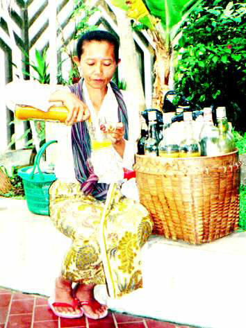 毎日、朝8時ごろ我が家にやって来てジャムーを売っているおばさん。44歳でジャムーを売ってもう17年になると言って笑っていた。ジャムーとは、インドネシアの漢方薬のようなもので、売る人によって、それぞれ秘伝があるそうで、ちよっと怪しい。健康によいもの、美容によいもの、痩身のきくもの、かぜにきくもの、いろいろ言うと、その場で調合してくれる。カインパンジャンと言う長い伝統的な茶色のバティックをまいて、かごを背負っている。手持ちのかごも持っていて、この中には、粉末のジャム−を持っている。歩く富山の薬売りのようである。けっこうきれいなお姉さんが多い。ソロやジョグジャの人がほとんどだそうだ。今は、1杯1000ルピア。 |