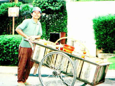 ミ−ニャックミ−ニャック・・・と言いながら、油を売り歩く油売りのおじさん。油と言っても、食用油ではなく、ランプなどに使う油を売っている。はかり売りをしている。