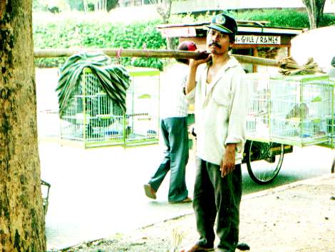 よくポンドックの木陰で休んでいる鳥やさん。休んでいるところだったけど、鳥かごを担いでもらった。ちょっとだるそう・・・・まるでペンキでも塗ったような鳥を売っていることもあるけど、この時持っていた鳥は普通の鳥だった。