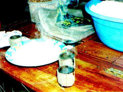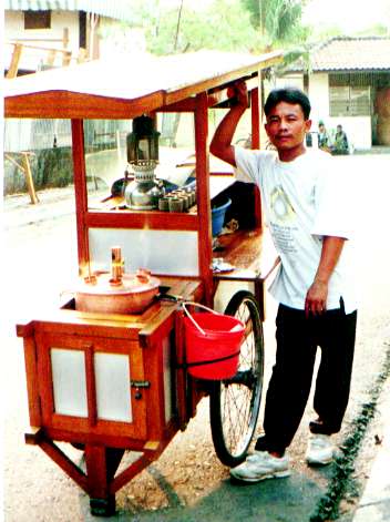 「ポー」という蒸気の音がすると、このおじさんが通った。プトウというお菓子売り。餅米を小さな竹筒につめて、中心にグラメラという砂糖を入れて蒸す。10個3000ルピアだった。ほかほかと暖かい時は、蒸しパンの様でおいしかった。インドネシアでは、夕方から夜になって、少し涼しくなった頃、売りに来る。