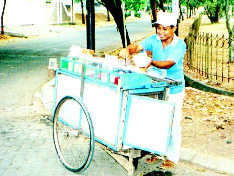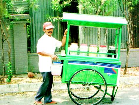 チンチンチンとガラスのコップをスプーンでならしながら売り歩く。エスチェンドルを頼むとにこにこして作ってくれた。食パンのみみ、タピオカ、ナンカ、ゼリーの様なもの、などをまず入れて、氷をガリガリこすりかけ、その上にピンクの液をかけ、最後に練乳をかけてくれた。ただの氷と違って色々な物が入っているのでお腹いっぱいになる。1杯1000ルピアなり。おそるおそる食べてみたら、いちごミルク氷みたいで恐れを忘れて食べてしまった。もう一つの写真は、バケツを持ったエスチェンドルやさん。このバケツがくせものなのだ。ガラスのコップをこの中で洗っては使い洗っては使いするので、あまり衛生的とは言えないからだ。氷の方もどんな水から出来ているのだろうと考えるとぜったい食べれないだろう。 |
