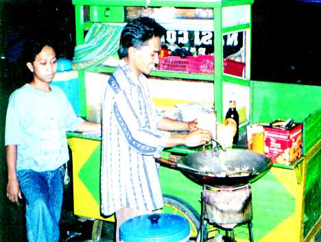ナシゴレンとは焼きめしのこと。手際よく、卵、ねぎを油で炒め、米を炒めケチャップマニスとサンバル、味の素で味をつける。味の素はたっぷりふりかけ、最後にクルプックというインドネシアのえびせんをのせて、はい、出来上がり。1皿2000ルピア。なかなかおいしい!