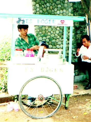 いちご氷の様なものが、最初から銀色の大きな鍋の中にたっぷり入っている。下の濃いピンクはタピオカ、その上の黒っぽい物は、赤餅米、黄色はナンカ。赤餅米のもったり感と氷のシャリシャリ感、タピオカのプリプリ感が何とも言えずついつい食べて、途中チフスとコレラのことを思いだし、ガラスのコップのエスドッケルを袋に入れてもって帰ろうとしたら、このおにいちゃん、気前良く袋一杯つめてくれた。1000ルピアだった。その後、お腹の調子は大丈夫だった。ちょっと自信がついた。