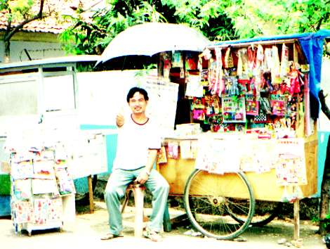 色々のおもちゃや、ゲームをもっていた。ミニ四駆までもっていた。5000ルピアだった。くじは、一回100ルピアで何のカードが出てくるか、賭けて、当たったら100ルピア返してくれると言うものだった。 |