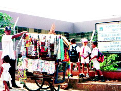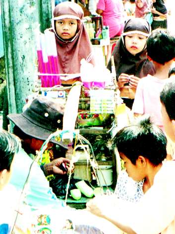 1カップ200ルピアでカップゼリ−を売っていた。ピンクのすごい色のジュースも同様200ルピア。子供達が買い食いしやすい値段だ。 |