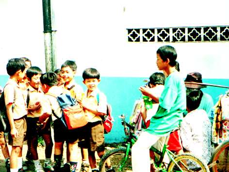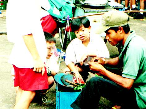 キリスト系の私立の学校の校庭にて。保護者の人が車で迎えに来るのを待っている間、飴細工を作ってもらっていた。1つ500ルピアで、こちらのテレビではやっているスパイダーマンを作っていた。 |