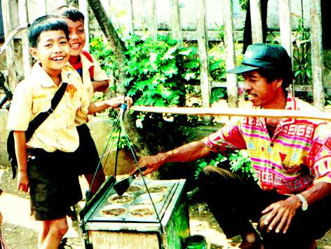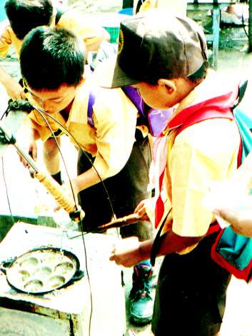 ねぎ入り卵焼きといった所。1つ100ルピアで自分で作らせてくれるのが人気なのか子供が集まって来ていた。うずら卵を1つ割って、中に自分の好きなだけねぎを入れて、たこ焼きの様に作っていた。 |